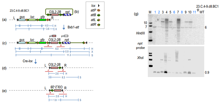 針對(duì)這個(gè)問(wèn)題,華南植物園分子中心博士后陳偉強(qiáng)及前博士研究生Gurminder Kaur等在研究員區(qū)永祥的指導(dǎo)下,再次利用Bxb1和Cre重組酶系統(tǒng)嘗試了新舊轉(zhuǎn)基因的替換。在具有att和lox序列的多基因整合株系上(圖中a),通過(guò)Bxb1-att系統(tǒng)首先疊加了一個(gè)帶有新基因OsO3L2-2B和lox位點(diǎn)的載體(圖中b)得到(圖中c),然后利用Cre-lox重組技術(shù),將舊基因簇gus-gfp-luc和疊加載體上包括篩選標(biāo)記npt在內(nèi)的非必需序列全部刪去,形成(圖中d)或(圖中e)的結(jié)構(gòu),即完成了新舊轉(zhuǎn)基因的替換。由于完成替換后的株系還含有att和lox序列,這就意味著新基因的疊加和替換可以在需要時(shí)繼續(xù)進(jìn)行下去。這個(gè)轉(zhuǎn)基因替換系統(tǒng)的出現(xiàn)大大增加了多基因分子育種的靈活性,而由于Bxb1和Cre重組酶的使用不受專利限制,更有利于此育種技術(shù)的自由使用并大大提高產(chǎn)品商品化的可能性。