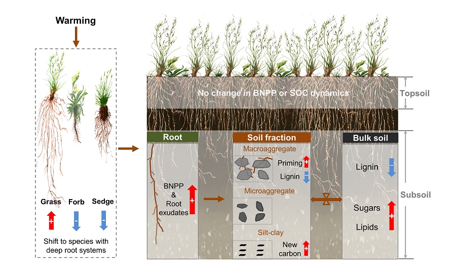 土壤是陸地生態(tài)系統(tǒng)中儲(chǔ)量最大的活躍碳庫(kù),其對(duì)全球變暖的響應(yīng)是全球變化生態(tài)學(xué)的焦點(diǎn)問(wèn)題。底層(即深度超過(guò)30cm)土壤儲(chǔ)存了全球一半以上的土壤碳庫(kù);然而,以往的增溫實(shí)驗(yàn)著重分析表層土壤的響應(yīng),底層土壤對(duì)增溫的響應(yīng)及其機(jī)制尚不明確。