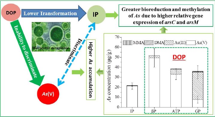 為了理清有關(guān)環(huán)境因素對藻類砷轉(zhuǎn)化與代謝的影響規(guī)律,近年來,中國科學(xué)院城市環(huán)境研究所城市水環(huán)境過程與生態(tài)風(fēng)險研究組研究員顏昌宙、副研究員羅專溪與閩南師范大學(xué)教授王振紅、美國麻省大學(xué)阿默斯特分校教授邢寶山、比利時根特大學(xué)教授Gijs Du Laing等開展合作研究,采用正交試驗設(shè)計方法(Taguchi methods),選擇五價無機(jī)砷、溶解性無機(jī)氮、溶解性無機(jī)磷和pH值作為主要影響因子,開展了一系列的室內(nèi)模擬研究來確定影響銅綠微囊藻砷生物轉(zhuǎn)化的最優(yōu)化條件及其動力學(xué)特征,結(jié)果發(fā)現(xiàn)低磷高氮環(huán)境有利于砷在藻里累積與轉(zhuǎn)化(總量提高且速率增加),相關(guān)研究成果分別發(fā)表在Water research (2017, 118: 167-176) 和Journal of Cleaner Production (2018, 199:112-120)上。鑒于磷對砷生物累積與轉(zhuǎn)化的特殊性,研究人員進(jìn)一步研究了溶解有機(jī)磷(DOP)對藻體中砷酸鹽(As(V))生物積累和轉(zhuǎn)化的影響規(guī)律,選取了三種不同的有機(jī)磷源(β甘油磷酸鈉(βP)、三磷酸腺苷(ATP)和6葡萄糖磷酸鈉(GP))與無機(jī)正磷酸鹽(IP)進(jìn)行比較,結(jié)果發(fā)現(xiàn)IP環(huán)境下銅綠微囊藻能高效識別As(V)和P,但在DOP環(huán)境則沒有觀察到這種識別能力。DOP環(huán)境特別是βP可顯著提高藻體對砷的累積;而GP則明顯促進(jìn)了砷的還原(三價砷高)與甲基化(有機(jī)砷高)。GP環(huán)境下藻體兩個砷還原與甲基化功能基因(arsC和arsM)的相對表達(dá)量較高,印證該GP磷環(huán)境下藻體砷還原和甲基化能力較高的事實(Environmental Pollution, 2019, 118: 167–176)。