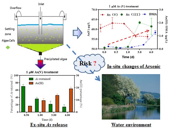 另外,為了找到藻類修復(fù)砷微污染水體后合適的處置方法,研究人員進(jìn)一步研究負(fù)載砷的藻體在混凝沉淀原位與異位處理時水中砷釋放與形態(tài)轉(zhuǎn)化規(guī)律。結(jié)果發(fā)現(xiàn),常見混凝藥劑中聚合氯化鋁對含砷藻體的沉淀去除效果最好。經(jīng)聚合氯化鋁沉淀去除的含砷藻體原位處理水中,總砷逐漸降低,但三價砷由于水環(huán)境處于還原狀態(tài)而在3天后顯著升高。而在沉淀含砷藻體異位處理的水體中,藻體砷釋放不僅與胞內(nèi)砷含量有關(guān),還與藻細(xì)胞活躍或熱處理的存活狀態(tài)、放置時間密切相關(guān)。結(jié)果表明含砷藻體原位或者異位處置時,為了降低潛在風(fēng)險,選擇合適的處置時間尤為重要。相關(guān)成果發(fā)表在Journal of Hazardous Materials (2020, 384, 121249)。這些研究結(jié)果有助于科學(xué)認(rèn)識砷在藻體中的生物代謝行為,在評價與砷污染水體藻類修復(fù)相關(guān)聯(lián)的關(guān)鍵環(huán)境因素和實際應(yīng)用方面具有十分重要的科學(xué)意義。以上研究得到國家自然科學(xué)基金項目、福建省科技引導(dǎo)性項目和福建省新世紀(jì)優(yōu)秀人才支持計劃等的資助。