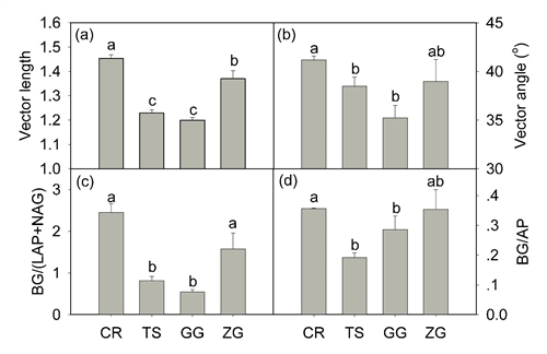 圖1 不同農(nóng)業(yè)轉(zhuǎn)化策略對土壤微生物養(yǎng)分限制狀態(tài)的影響