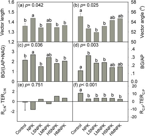 圖2 不同施肥策略對土壤微生物養(yǎng)分限制狀態(tài)的影響