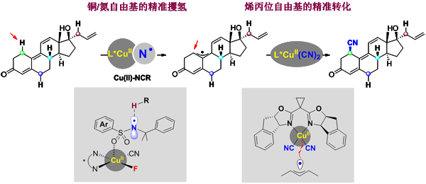 為了探索碳?xì)滏I的精準(zhǔn)轉(zhuǎn)化,劉國(guó)生課題組開展了研究。在2016年,他們與美國(guó)威斯康欣大學(xué)教授Stahl合作,首次提出了銅催化自由基接力的新概念,實(shí)現(xiàn)了芐位C-H鍵的不對(duì)稱氰化反應(yīng),揭示了手性的兩價(jià)銅氰物種可以有效地捕捉芐位自由基,以非常高效、高對(duì)映體選擇地得到手性腈類化合物,從而實(shí)現(xiàn)了從簡(jiǎn)單石油化工產(chǎn)品到藥物分子前體的直接轉(zhuǎn)化(Science 2016, 353, 1014);這不僅回答了上述的第二個(gè)科學(xué)問(wèn)題,也為第一個(gè)科學(xué)問(wèn)題的研究奠定了堅(jiān)實(shí)的基礎(chǔ)。