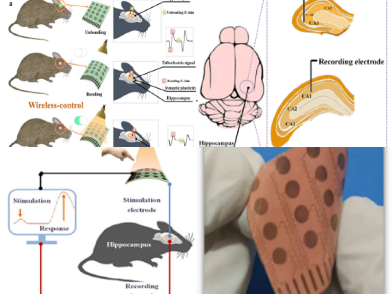 科研人員在動(dòng)物模型中進(jìn)行驗(yàn)證,將電子皮膚連接小鼠腦部海馬CA3區(qū)域,人工使電子皮膚發(fā)生形變產(chǎn)生電刺激,并在海馬CA1區(qū)記錄到興奮性突觸后電位,實(shí)驗(yàn)結(jié)果表明海馬電刺激可誘發(fā)大腦活動(dòng)和突觸改變,通過(guò)對(duì)突觸電位的量化度量可以表征突觸可塑性。這項(xiàng)研究表明,未來(lái)自驅(qū)動(dòng)電柔性電子皮膚可以應(yīng)用于神經(jīng)刺激并有效量化神經(jīng)功能的變化,并且可以擴(kuò)展到新穎的多功能無(wú)電池、無(wú)線控制、神經(jīng)刺激系統(tǒng)。