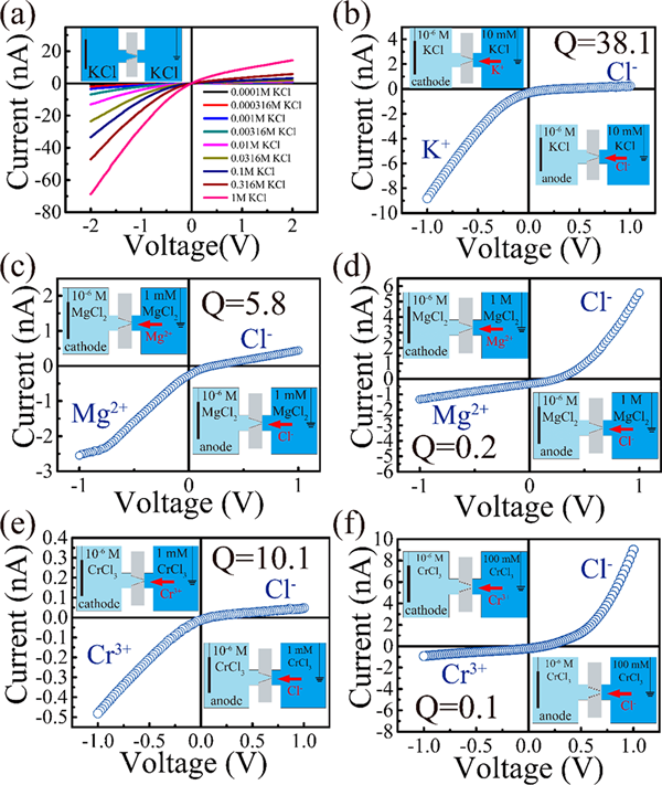 中國科學(xué)院近代物理研究所科研人員利用HIRFL高能微束裝置的單離子輻照技術(shù)和徑跡蝕刻法制備的PET單納米孔道,系統(tǒng)地研究了電場調(diào)控對納米通道表面電荷與離子輸運(yùn)的影響。研究發(fā)現(xiàn)二價和三價陽離子對PET納米孔道分別具有可逆和不可逆的表面電荷修飾作用,首次報道了納米孔道離子整流狀態(tài)轉(zhuǎn)變的閾值電壓存在。在電場作用下,納米孔道離子傳輸特性轉(zhuǎn)變主要是由于超過閾值電場時,孔道表面PET分子鏈的羧基-陽離子鍵破裂導(dǎo)致陽離子解離與孔道表面分子鏈重排,從而引起表面電荷密度與等效納米孔道口徑變化。這些發(fā)現(xiàn)可能揭示了電壓門控生物離子通道的工作機(jī)制,為微納孔道離子整流與過濾控制提供了新的視角,在離子分離、生物分子檢測和納米通道能量收集等領(lǐng)域有著潛在的應(yīng)用前景。