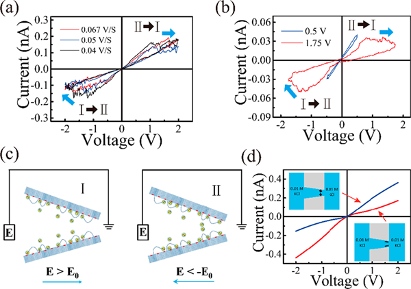 圖2 納米孔道的離子傳輸特性在超過閾值電場時發(fā)生狀態(tài)轉(zhuǎn)變