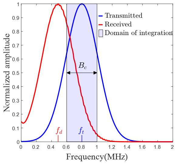 研究人員采用線性調(diào)頻信號作為編碼激勵信號,理論分析中忽略衰減響應(yīng)的頻散項,并假設(shè)換能器響應(yīng)為實對稱高斯信號,將編碼激勵脈沖壓縮后的峰值功率表示為頻域積分的形式,因為介質(zhì)的高聲衰減作用使高斯信號的載頻向低頻處漂移,所以可根據(jù)頻偏值修正編碼激勵的中心頻率,使脈沖壓縮后的主要能量集中于頻偏值附近從而獲得更高的信噪比增益。