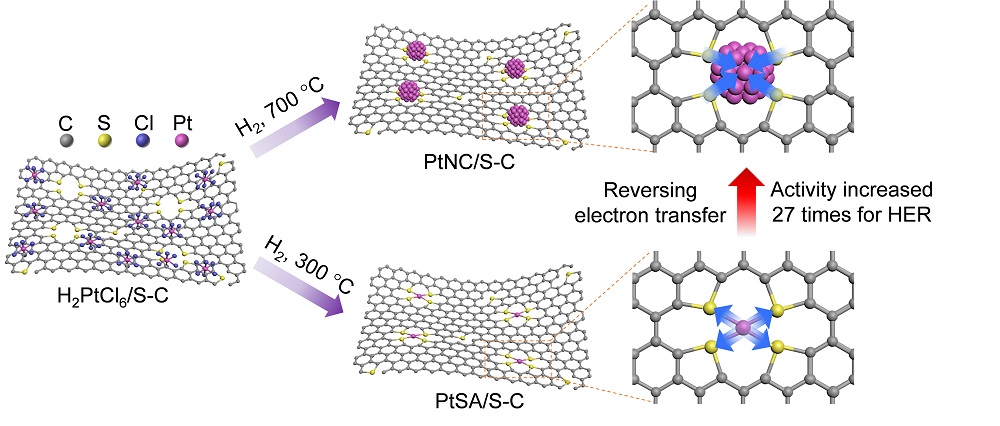 圖1. S-C負(fù)載的Pt單原子與Pt納米團(tuán)簇合成示意圖以及電荷轉(zhuǎn)移變化。