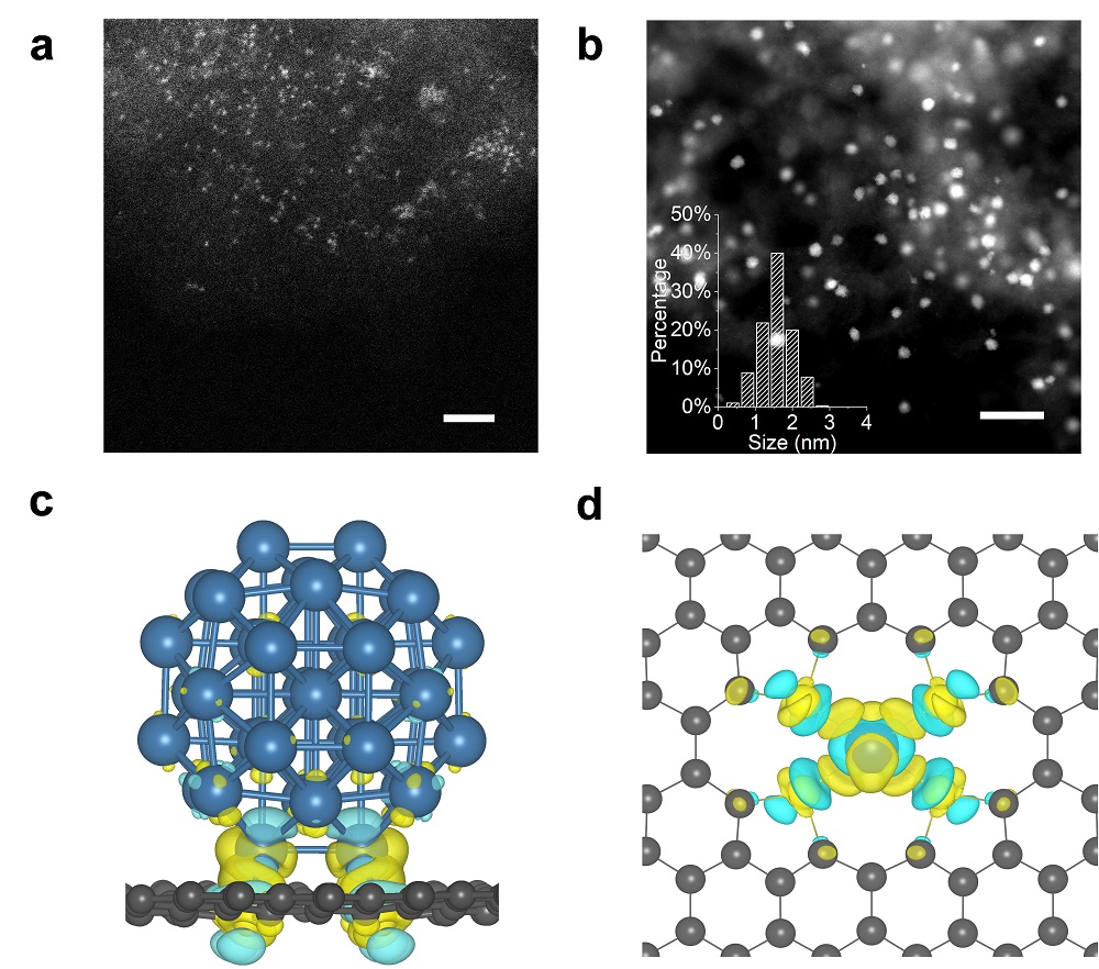 圖2. S-C負(fù)載的Pt單原子與Pt團(tuán)簇的結(jié)構(gòu)表征:(a)Pt單原子的HAADF-STEM圖;(b)Pt納米團(tuán)簇的HAADF-STEM圖;(c)Pt納米團(tuán)簇的差分電荷密度分析;(d)Pt單原子的差分電荷密度分析。