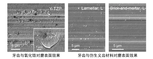 圖2:牙齒(牛牙)在模擬口腔環(huán)境中與氧化鋯以及新型仿生義齒材料對(duì)磨后的表面形貌