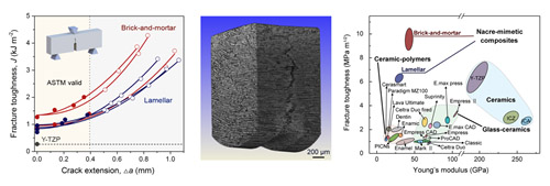 近期,中國科學(xué)院金屬研究所材料疲勞與斷裂實(shí)驗(yàn)室研究員劉增乾和張哲峰與美國加州大學(xué)伯克利分校教授Robert O. Ritchie以及吉林大學(xué)開展合作,他們結(jié)合生物力學(xué)原理,采取組成復(fù)合化和組織結(jié)構(gòu)仿生化設(shè)計(jì),將臨床應(yīng)用的氧化鋯陶瓷與生物相容性樹脂相結(jié)合,通過模仿天然貝殼珍珠層的微觀組織結(jié)構(gòu),設(shè)計(jì)研發(fā)了硬度、強(qiáng)度和模量均與人體正常牙齒(包括牙釉質(zhì)和牙本質(zhì))完全匹配的新型氧化鋯-樹脂仿生復(fù)合義齒材料。新型義齒材料微觀上具有與天然貝殼類似的組織結(jié)構(gòu),氧化鋯以片層形式平行排列或以“磚墻”形式緊密堆疊,其間的空隙以樹脂填充,如圖1所示。同時(shí),他們提出了能夠準(zhǔn)確描述并預(yù)測(cè)仿生材料模量的力學(xué)模型,并且通過調(diào)控材料的微、納米尺度組織結(jié)構(gòu),實(shí)現(xiàn)了新型義齒材料的硬度、強(qiáng)度和模量與人體正常牙齒的完全匹配。