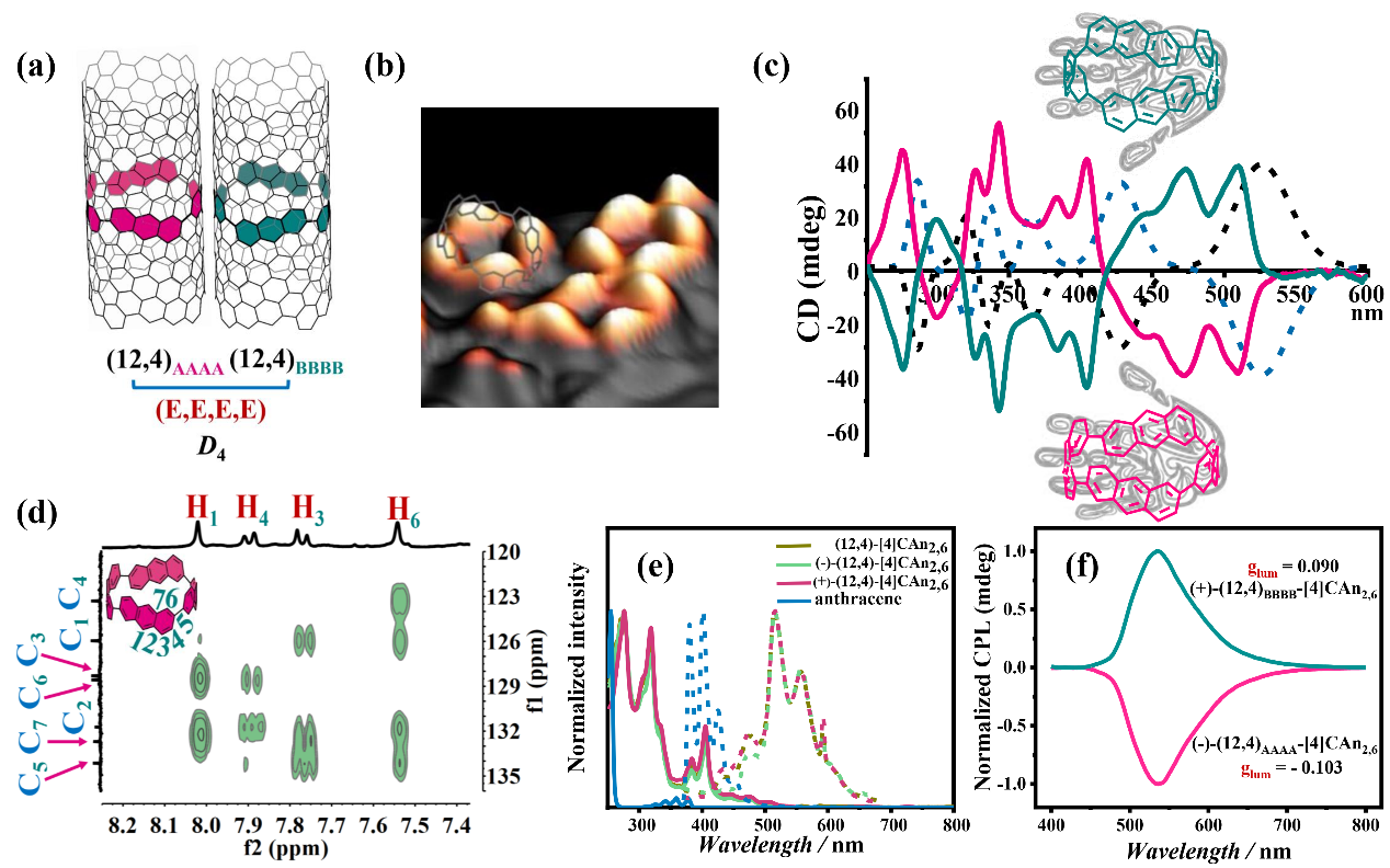 圖1. [4]CAn2,6手性碳納米大環(huán)的表征及其性質(zhì)研究。(a)嵌入在相應(yīng)碳納米管中的[4]CAn2,6大環(huán)及其手性指數(shù)、單體連接單鍵處的立體構(gòu)型、所屬分子點(diǎn)群;(b) 3D高分辨STM圖像;(c) CD光譜;(d) 2D (H, C)-HMBC NMR譜;(e) 紫外及熒光光譜;(f) CPL光譜。