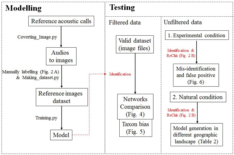 蝙蝠超聲波識別軟件Waveman的建模和測試流程圖。建模大致分為三個步驟:音頻數(shù)據(jù)庫構建、圖片轉化和訓練模型。采用兩種數(shù)據(jù)類型進行測試,包括圖片數(shù)據(jù)和野外采集未經處理音頻的數(shù)據(jù)。