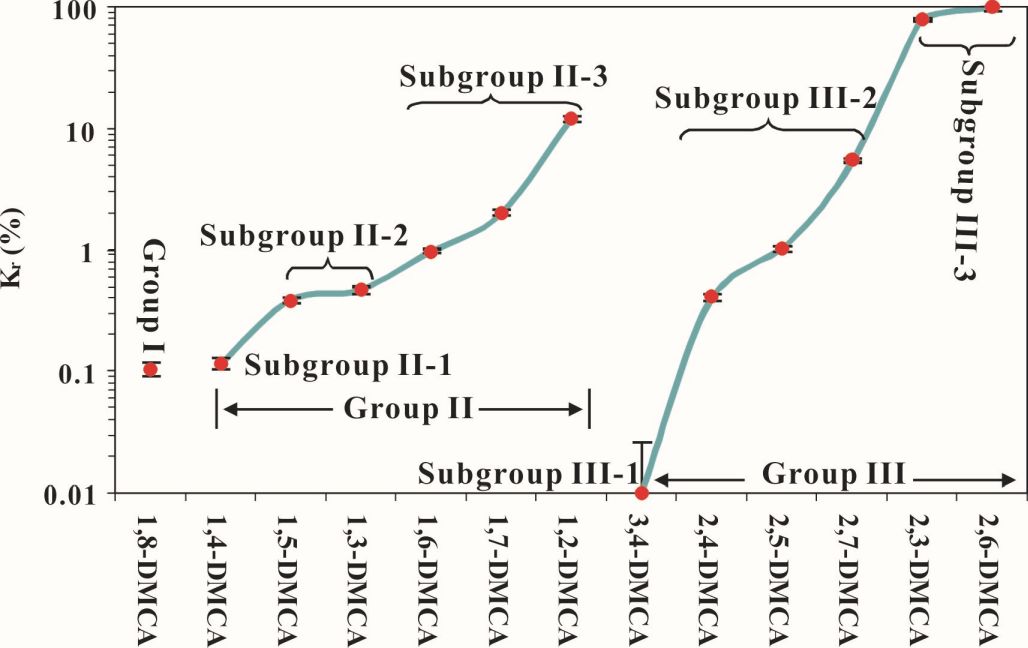 圖1 各組二甲基咔唑吸附能力排序圖(DMCA=二甲基咔唑; Kr = 相對(duì)吸附系數(shù))