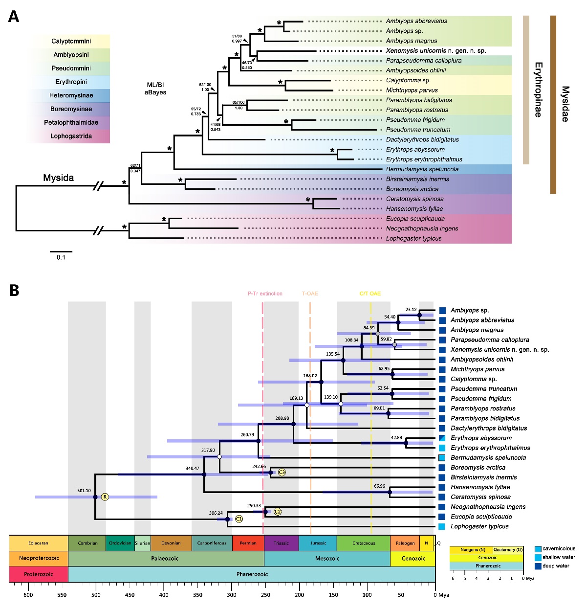 研究團(tuán)隊(duì)聯(lián)合挪威卑爾根大學(xué)、中科院深海科學(xué)與工程研究所,根據(jù)“萬泉”號(hào)著陸器從馬里亞納海溝7449米采集到的樣品,基于其特殊形態(tài)結(jié)構(gòu)和分子生物學(xué)證據(jù)建立了深??肺r類的一新屬一新種,命名為Xenomysis unicornis Kou, Meland & Li, 2019,意為“深淵中的獨(dú)角獸”,這也是目前已報(bào)道糠蝦目甲殼動(dòng)物物種的最深記錄。研究團(tuán)隊(duì)還通過多基因的系統(tǒng)發(fā)育分析對(duì)糠蝦目(Mysida)高級(jí)分類階元的劃分提出了新觀點(diǎn),并通過化石年代標(biāo)定與分子鐘分析推測糠蝦類在中生代發(fā)生過多次由淺海向深海的擴(kuò)散,這與地質(zhì)史上三次大規(guī)模的海洋缺氧事件時(shí)間吻合。此外,研究還發(fā)現(xiàn)深??肺r類退化的眼板并非之前所認(rèn)為的單一起源,而是平行演化的結(jié)果。該研究結(jié)果進(jìn)一步揭示了深淵的生物多樣性,為深海無脊椎動(dòng)物起源、系統(tǒng)發(fā)育和適應(yīng)性進(jìn)化研究提供了新的見解和參考依據(jù)。