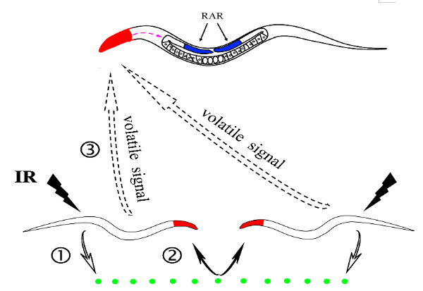 在該實(shí)驗(yàn)體系中,底部培養(yǎng)線蟲(chóng)接受25Gy的伽馬射線輻射后,頂部線蟲(chóng)頭部的化感神經(jīng)感知?dú)怏w損傷信號(hào),遠(yuǎn)程調(diào)控線蟲(chóng)雌性生殖腺有絲分裂區(qū)細(xì)胞的DNA損傷檢驗(yàn)點(diǎn)和核苷酸修復(fù)機(jī)制,啟動(dòng)對(duì)后續(xù)輻射胚胎致死的適應(yīng)性反應(yīng)。雄蟲(chóng)趨向?qū)嶒?yàn)表明:輻射產(chǎn)生的氣體信號(hào)在生物學(xué)功能和化學(xué)性質(zhì)上不同于現(xiàn)有的性激素,是一種新的揮發(fā)性線蟲(chóng)激素。進(jìn)一步實(shí)驗(yàn)顯示:在底部線蟲(chóng)中,水溶性的蛔甙以一種群體依賴的方式調(diào)控了這種揮發(fā)性輻射信號(hào)的產(chǎn)生(圖2)。該發(fā)現(xiàn)為個(gè)體間輻射旁效應(yīng)的研究提供了新的線索和方向。