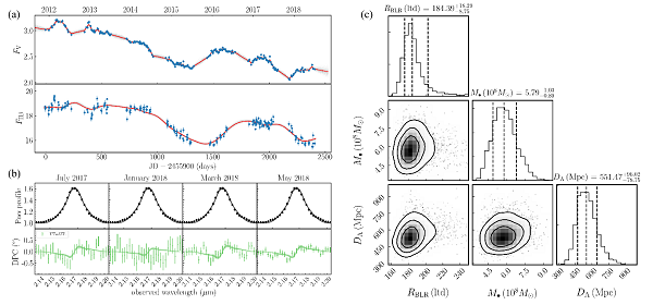 圖(a)為反響映射觀測(cè)得到的連續(xù)譜、發(fā)射線光變曲線及其擬合結(jié)果;圖(b)為GRAVITY觀測(cè)得到的發(fā)射線輪廓、較差相位曲線及其擬合結(jié)果;圖(c)為擬合得到的3C 273距離、寬線區(qū)半徑和黑洞質(zhì)量的概率分布。圖片由王建民團(tuán)隊(duì)提供