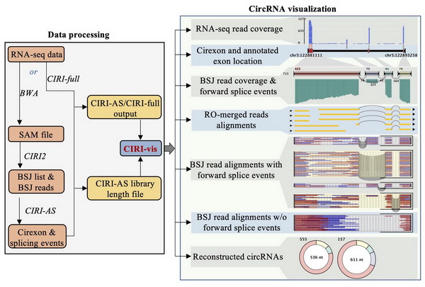 1月18日,中國(guó)科學(xué)院北京生命科學(xué)研究院趙方慶團(tuán)隊(duì)于Bioinformatics 雜志上在線刊發(fā)了題為Visualization of circular RNAs and their internal splicing events from transcriptomic data 的研究。該研究主要開(kāi)發(fā)了環(huán)形RNA的可視化工具——CIRI-vis軟件,具有將CIRI-AS或CIRI-Full的輸出結(jié)果可視化,且可以批量展示環(huán)形RNA上的讀段信息與內(nèi)部結(jié)構(gòu)的優(yōu)勢(shì)。