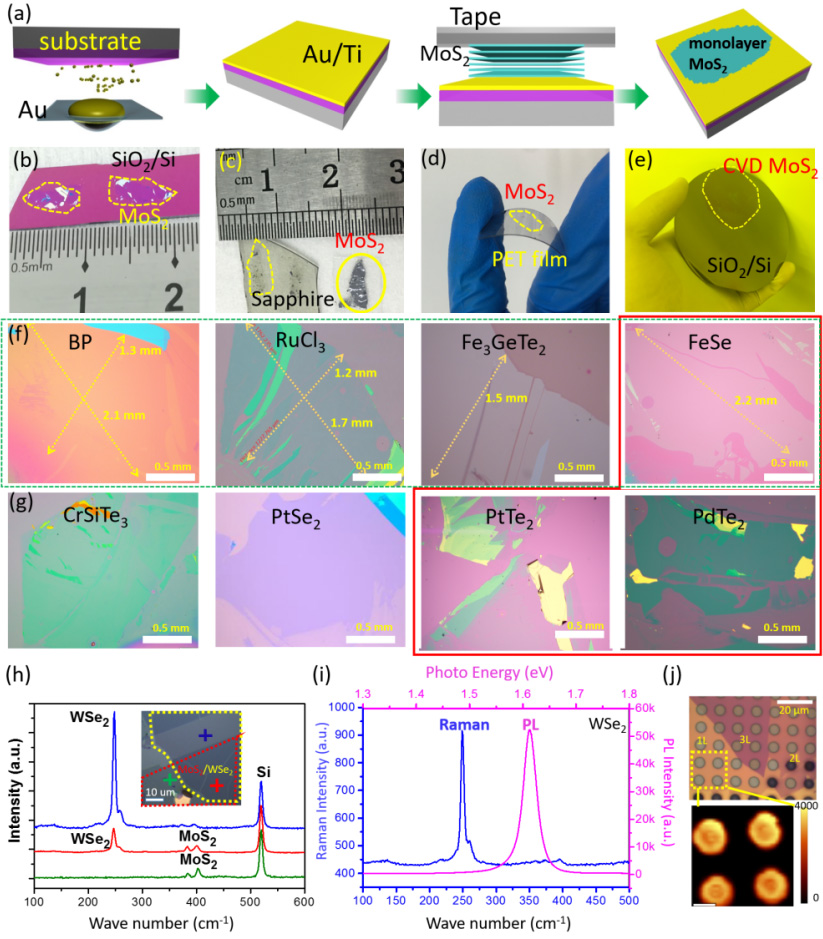圖2. 機械解理獲得多種大面積高質(zhì)量超薄二維材料。(a) 新型機械解理的步驟; (b-e) 不同基底上解理得到的大面積MoS2; (f-g) 解理得到的多種大面積二維材料;(h-j) 異質(zhì)結(jié)及懸空二維材料的拉曼光譜及熒光光譜。