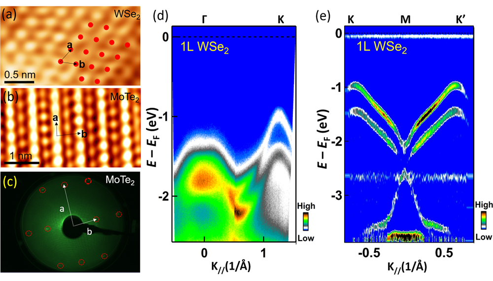 圖4. 在大面積的單層樣品上獲得的原子圖像、低能電子衍射斑點及能帶結(jié)構(gòu)圖。