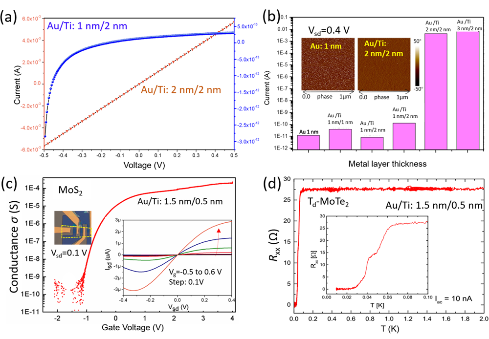圖5. 通過控制金屬膜的厚度,可以獲得絕緣的金屬膜,可以在器件中實現(xiàn)高開關(guān)比和超導(dǎo)特性測量。