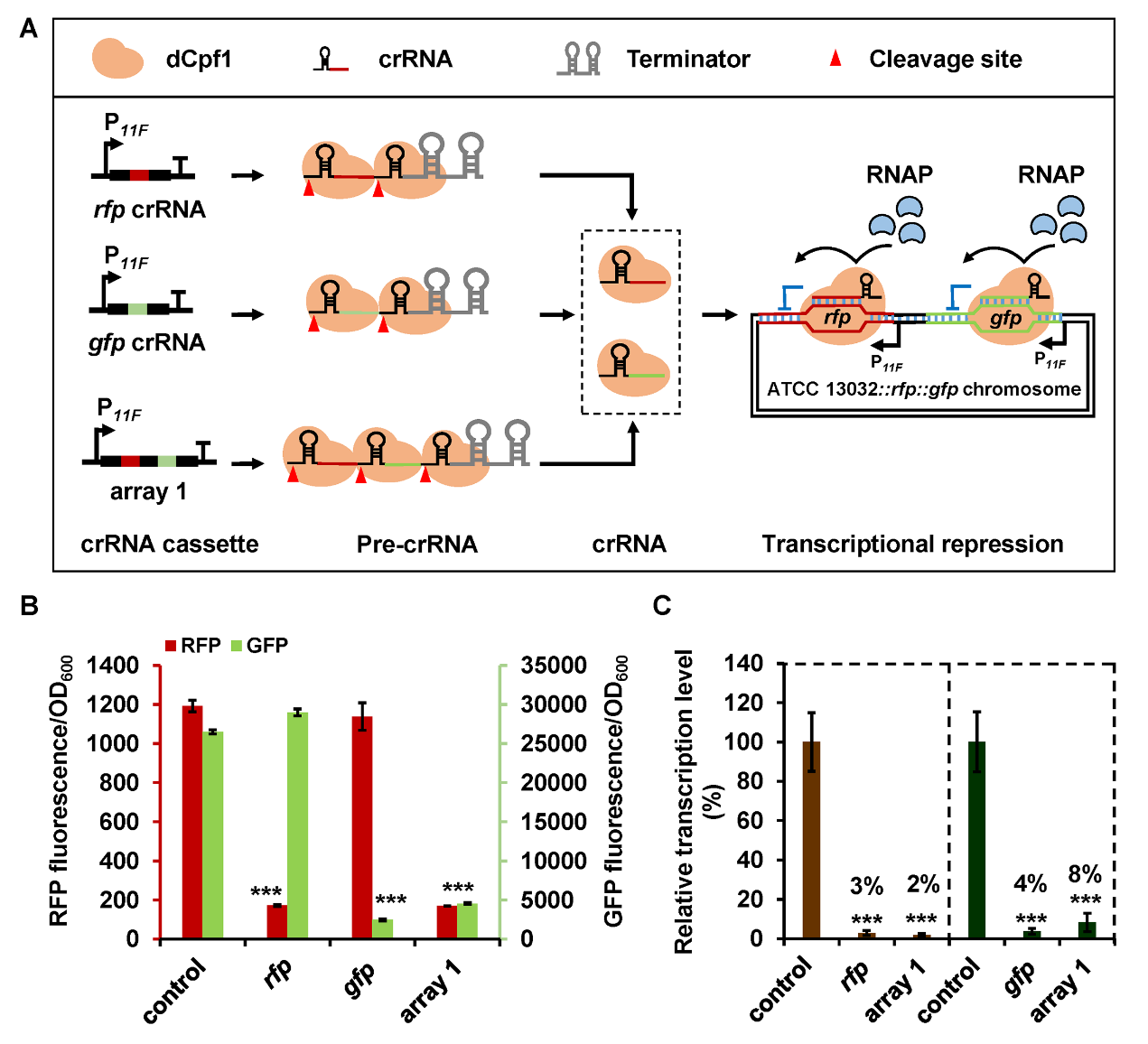 中國科學院天津工業(yè)生物技術研究所研究員鄭平帶領的系統(tǒng)與合成生物技術研究團隊和研究員孫際賓帶領的系統(tǒng)生物學中心研究團隊合作,前期在谷氨酸棒桿菌中建立了基于人工合成sRNA的基因表達沉默技術(Metabolic engineering of Corynebacterium glutamicum by synthetic small regulatory RNAs. J. Ind. Microbiol. Biotechnol., 2019, 46, 203-208),實現(xiàn)了染色體基因表達的快速下調,單基因弱化效率達到80%以上。近日,兩研究團隊再次合作,在谷氨酸棒桿菌中開發(fā)建立了基于CRISPR/dCpf1的多基因表達調控技術,實現(xiàn)了多個目標基因的快速表達調控。首先,該研究在谷氨酸棒桿菌中優(yōu)化了dCpf1的表達,并通過不同突變位點的驗證,發(fā)現(xiàn)D917A和E1006A組合突變體具有更好的弱化效果,報告基因的表達強度下調了89%。隨后,研究人員設計了基于Golden Gate的crRNA快速構建策略,通過一步反應,即可快速構建包含多個靶基因結合序列的crRNA array。利用上述技術,該研究在谷氨酸棒桿菌中分別進行了雙報告基因以及賴氨酸合成途徑中4個內源基因的同時弱化,結果顯示目標基因的弱化效率均達到90%以上,獲得的多基因組合調控的工程菌株賴氨酸產量和轉化率提高了4倍,為谷氨酸棒桿菌的代謝工程改造提供了一種重要的調控工具。