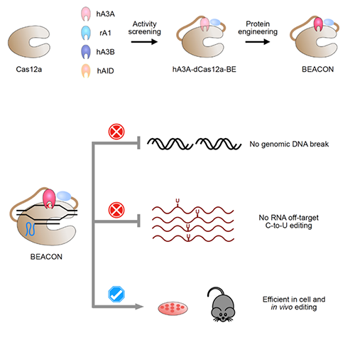 由DNA突變所引起的遺傳性疾病,存在發(fā)病原因多樣、患者眾多、傳統(tǒng)治療方法效果差、費用高等特點。雖然利用CRISPR/Cas堿基編輯技術(shù)及最近融合了CRISPR/Cas和堿基編輯酶的堿基編輯器(Base editors, BEs)理論上能夠矯正引發(fā)疾病的DNA突變,但是存在包括引起基因組DNA損傷、激活DNA損傷修復(fù)通路進而導致細胞的凋亡等一系列安全問題。為了解決這一安全性問題,研究人員對前期基于dCas12a(Li et al., Nat Biotechnol 2018)或者是nCas9(Wang et al., Cell Rep 2017; Wang et al., Nat Biotechnol 2018)構(gòu)建的一系列BEs開展比較研究,發(fā)現(xiàn)雖然前期構(gòu)建的dCas12a-BEs具有堿基編輯效率低下的缺點,但是其僅存在與對照一致的本底水平DNA損傷響應(yīng),提示dCas12a-BEs可能具有更高的安全性。為了提高dCas12a-BEs的堿基編輯效率,研究人員通過篩選和蛋白質(zhì)工程改造等方法構(gòu)建了基于hA3A和dCas12a的新一代堿基編輯系統(tǒng)BEACONs(Base Editing induced by human APOBEC3A and Cas12a without DNA break)。與目前所有的堿基編輯器相比,BEACON系列堿基編輯器在基因組產(chǎn)生高效堿基編輯的同時,僅具有本底水平的DNA損傷激活應(yīng)答和本底水平的轉(zhuǎn)錄組RNA脫靶。更為重要的是,BEACON系統(tǒng)在小鼠動物體內(nèi)也成功實現(xiàn)了精準、安全的堿基編輯。BEACON具備前期一系列堿基編輯系統(tǒng)的有效性、精準性和安全性,為堿基編輯系統(tǒng)在基礎(chǔ)研究及未來臨床領(lǐng)域的全面深入應(yīng)用提供了更優(yōu)的選擇。在研究中,研究人員還構(gòu)建了新一代的全轉(zhuǎn)錄組RNA編輯檢測計算分析流程RADAR(RNA-editing analysis-pipeline to decode all-twelve-types of RNA-editing),可以準確高效地檢測堿基編輯中存在的RNA水平脫靶效應(yīng)。