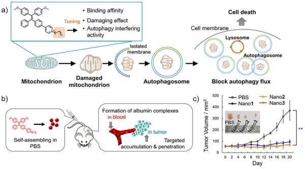 近日,課題組合作設計合成具有不同長度烷基側鏈的四苯乙烯吡啶鹽分子,發(fā)現(xiàn)這些分子可與血液中的白蛋白自發(fā)組裝形成復合物,并通過血液循環(huán)靶向定位到腫瘤組織。進一步研究發(fā)現(xiàn),隨著烷基鏈長度的增加,分子與白蛋白(albumin)疏水空腔的結合力增強,對腫瘤細胞的線粒體定位能力也增強。更為重要的是,分子定位到線粒體后對線粒體產(chǎn)生氧化損傷,導致線粒體發(fā)生腫脹變形。生物透射電鏡和熒光自噬指示分析證明,分子不僅導致腫瘤細胞內自噬小體(autophagosome)的累積,而且抑制了自噬小體與溶酶體的融合,使自噬通路受阻,最終導致腫瘤細胞死亡。利用荷瘤小鼠模型,該研究示蹤定位了分子穿透到腫瘤內部進行富集的特點,通過自噬干預的新途徑,對高惡性度的腦腫瘤實現(xiàn)了有效抑制。