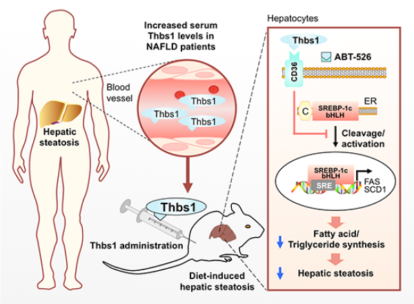 循環(huán)中的Thbs1蛋白水平隨著肝臟脂肪含量的增加而代償性增加。外源給予Thbs1蛋白可以改善飲食誘導的小鼠肝臟脂質沉積,這種改善作用是通過Thbs1-CD36-SREBP-1信號軸抑制肝細胞脂質合成途徑實現(xiàn)的。Thbs1及其多肽類似物可能是非酒精性脂肪肝的潛在治療靶標。