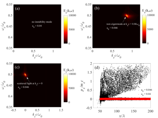 研究團隊從理論分析和數(shù)值模擬兩個方面介紹了這一新的SRS機制,兩者符合度好。模擬結(jié)果如圖所示,當入射光強超過激發(fā)閾值,會發(fā)現(xiàn)有非本征SRS的激發(fā)。這一機制的提出對非線性物理的研究具有推動作用,并為慣性約束聚變研究中激光等離子體參量過程的認識和抑制提供參考。