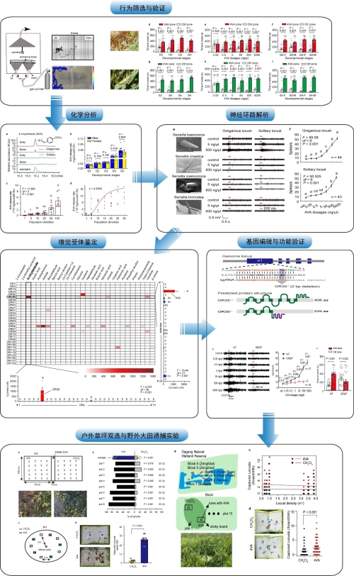 最近,中科院動(dòng)物研究所康樂(lè)院士團(tuán)隊(duì)通過(guò)分析飛蝗群居型和散居型飛蝗的體表和糞便揮發(fā)物,在35種化合物中鑒定到了一種由群居型蝗蟲特異性揮發(fā)的氣味,釋放量低但生物活性非常高的化合物,4-vinylanisole(4VA,4-乙烯基苯甲醚)。通過(guò)一系列行為實(shí)驗(yàn)確定4VA對(duì)群居型和散居型飛蝗的不同發(fā)育階段和性別都有很強(qiáng)的吸引力。4VA能夠響應(yīng)蝗蟲種群密度的變化,隨著種群密度增加而增加,甚至它的產(chǎn)生可由4-5只散居飛蝗聚集而觸發(fā),具有很低的誘發(fā)閾值。研究人員在飛蝗觸角上的四種主要感器類型中,發(fā)現(xiàn)了4VA特異引起錐形感器的反應(yīng)。在蝗蟲的上百個(gè)嗅覺受體中,他們發(fā)現(xiàn)定位在錐形感器中的嗅覺受體OR35是4VA的特異性受體。當(dāng)使用基因編輯技術(shù)CRISPR/Cas9敲除OR35后,飛蝗突變體的觸角與錐形感器神經(jīng)電生理反應(yīng)顯著降低,突變體也對(duì)4VA的響應(yīng)行為和吸引力喪失。那么4VA在戶外和自然環(huán)境中能夠吸引和聚集蝗蟲嗎?研究人員將含有4VA的誘芯布置在田間,通過(guò)室外草地雙選和誘捕實(shí)驗(yàn)證明4VA對(duì)實(shí)驗(yàn)室種群在戶外具有很強(qiáng)的吸引力。進(jìn)而,他們將誘芯直接布局到蝗蟲野外發(fā)生區(qū)天津北大港,大范圍的區(qū)塊實(shí)驗(yàn)再一次證明4VA不僅能吸引野外種群,而且不受自然環(huán)境中蝗蟲背景密度的影響。本研究首次從化學(xué)分析、行為驗(yàn)證、神經(jīng)電生理記錄、嗅覺受體鑒定、基因敲除和野外驗(yàn)證等多個(gè)層面對(duì)飛蝗群居信息素進(jìn)行了全面而充分的鑒定和驗(yàn)證,發(fā)現(xiàn)和確立了4VA是飛蝗群聚信息素,而過(guò)去報(bào)道已知的其他化合物都不具備群聚信息素的所有條件,本項(xiàng)研究范式將化學(xué)生態(tài)學(xué)的研究提高到一個(gè)新的階段。因此,這項(xiàng)研究被認(rèn)為是昆蟲學(xué)研究的一個(gè)重要突破。文章在審稿之際,三位審稿人對(duì)文章分別給予了高度評(píng)價(jià),兩位匿名審稿人認(rèn)為“該研究旨在闡明4VA作為群居信息素在飛蝗群聚過(guò)程中的作用,是一項(xiàng)令人印象深刻的、高技術(shù)的、深入的研究?!?;“本研究聚焦于一個(gè)極具吸引力的生物學(xué)問(wèn)題,在這個(gè)領(lǐng)域取得了非常重要的進(jìn)展”。一位透明審稿人是國(guó)際著名神經(jīng)生物學(xué)家、美國(guó)科學(xué)院院士、美國(guó)洛克菲勒大學(xué)萊斯莉·沃斯霍爾(Leslie B. Vosshall)教授,她在審稿意見中明確表示“這項(xiàng)工作做出了令人興奮的發(fā)現(xiàn),找到了一個(gè)人們長(zhǎng)期尋找的蝗蟲群聚信息素分子。文章包含了令人吃驚的多個(gè)層次的研究,我給予我無(wú)條件地支持,這項(xiàng)杰出的工作不要有任何拖延應(yīng)該優(yōu)先在《自然》雜志上發(fā)表?!?。