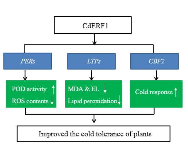 進展二:以上述篩選獲得的耐寒和低溫敏感狗牙根種質(zhì)為材料,低溫處理后進行RNA-Seq分析,鑒定到一個受低溫顯著誘導的基因CdERF1,且其在抗寒種質(zhì)中表達水平更高。CdERF1基因編碼的蛋白定位于細胞核內(nèi),具有轉(zhuǎn)錄激活活性。異源表達CdERF1能增強轉(zhuǎn)基因擬南芥的耐寒性,具體表現(xiàn)在葉片電解質(zhì)滲透率(EL)、丙二醛(MDA)、ROS含量的降低,SOD、POD酶活性的升高。而利用病毒誘導基因沉默(VIGS)方法抑制狗牙根內(nèi)源CdERF1的表達,導致狗牙根對低溫脅迫更加敏感。以過表達轉(zhuǎn)基因擬南芥和VIGS狗牙根為材料進行RNA-Seq分析,發(fā)現(xiàn)狗牙根CdERF1可能通過轉(zhuǎn)錄調(diào)控抗氧化基因(POD)、脂轉(zhuǎn)移蛋白家族基因(LTP)以及CBF2基因的表達來響應低溫脅迫。研究對于了解狗牙根抗寒機理具有理論意義,為通過基因工程技術快速、精準培育耐低溫狗牙根種質(zhì)提供新的基因資源。相關研究成果以The Ethylene Responsive Factor CdERF1 from Bermudagrass (Cynodon dactylon) Positively Regulates Cold Tolerance為題,發(fā)表在Plant Science上。