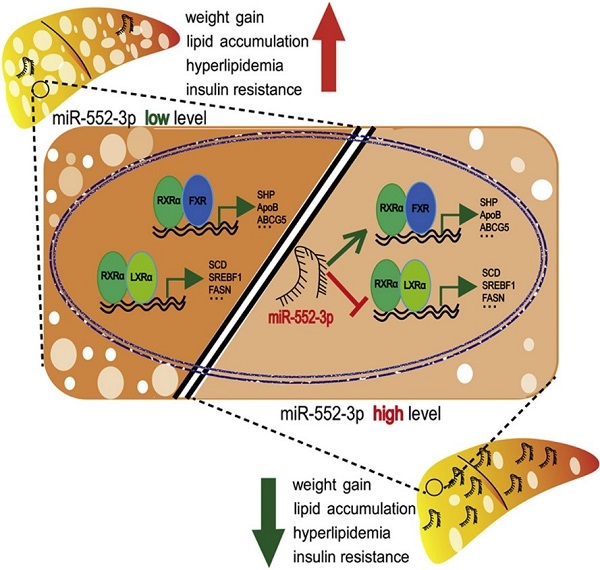 模式圖:miR-552-3p在細(xì)胞核內(nèi)調(diào)控FXR和LXR轉(zhuǎn)錄活性從而調(diào)節(jié)肝臟糖脂代謝功能異常