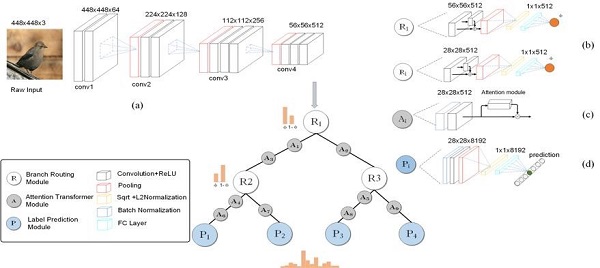 針對(duì)這一問題,軟件所團(tuán)隊(duì)將卷積神經(jīng)網(wǎng)絡(luò)與軟決策樹策略相結(jié)合,提出一種二分類深度神經(jīng)樹的細(xì)粒度圖像識(shí)別模型,該模型包括主干模型(backbone)、路由(router)、轉(zhuǎn)換(transformer)、預(yù)測(cè)(predictor)四種模塊構(gòu)成。在特征提取的主干網(wǎng)絡(luò)上,選取VGG-16作為團(tuán)隊(duì)的特征提取器,這一部分包括VGG-16的conv1-conv5的部分卷積層。在淺層利用路由進(jìn)行二分類的預(yù)測(cè)輸出,將圖像預(yù)先做粗粒度分類,隨著樹的深度增加,類別的區(qū)分范圍不斷縮小,并在葉子節(jié)點(diǎn)處進(jìn)行最終類別的輸出。借助這種由粗分逐漸到細(xì)分的方法,團(tuán)隊(duì)在神經(jīng)樹的邊上構(gòu)造了由卷積算子構(gòu)成的變換模塊,在不同的分支上利用卷積網(wǎng)絡(luò)進(jìn)行特征學(xué)習(xí),定位出具有判別力的區(qū)域特征,使每個(gè)葉子節(jié)點(diǎn)上的預(yù)測(cè)器測(cè)重關(guān)注圖像不同的區(qū)域。為加強(qiáng)不同分支對(duì)圖像多尺度特征的提取,團(tuán)隊(duì)采取非對(duì)稱策略來安排轉(zhuǎn)換模塊在不同分支上的數(shù)量,而不同的分支之間起到了相互補(bǔ)充與促進(jìn)特征學(xué)習(xí)的作用。在預(yù)測(cè)階段,團(tuán)隊(duì)利用路由模塊預(yù)測(cè)值的累積作為該路徑被選擇的概率,相應(yīng)的葉子節(jié)點(diǎn)的輸出則是該類別的預(yù)測(cè)概率分布。