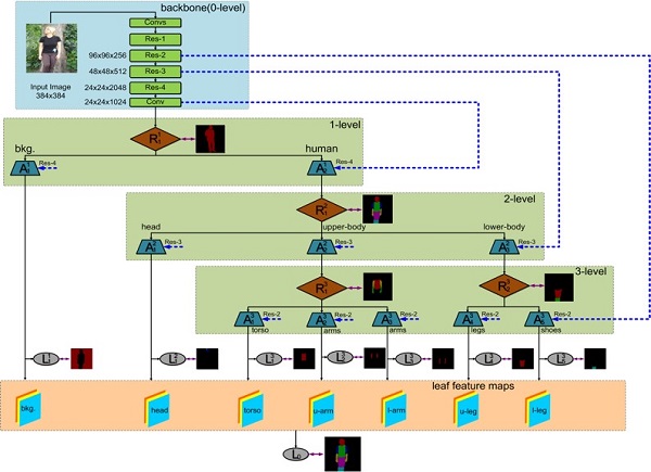 針對(duì)這一問題,軟件所團(tuán)隊(duì)提出一種基于深度神經(jīng)樹來學(xué)習(xí)語義特征。多叉深度神經(jīng)解析樹采用了一種層次關(guān)系,在淺層中,團(tuán)隊(duì)先把圖像中的前景與背景進(jìn)行識(shí)別,利用產(chǎn)生的掩碼信息作用在輸入數(shù)據(jù)上,產(chǎn)生新的前景信息將輸送到下一層模塊處理,在不同的層級(jí)上,團(tuán)隊(duì)會(huì)將相應(yīng)的部位識(shí)別并分割出來。此外,團(tuán)隊(duì)還構(gòu)造了融合模塊用來收集在不同的層級(jí)產(chǎn)生的結(jié)果,并將結(jié)果進(jìn)一步優(yōu)化調(diào)整,產(chǎn)生最終的分割預(yù)測(cè)結(jié)果。