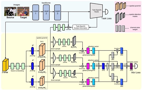 針對(duì)這一問題,軟件所團(tuán)隊(duì)提出空間注意力金字塔機(jī)制,將域轉(zhuǎn)換的注意力集中在與任務(wù)相關(guān)的特定區(qū)域。此方法將特征圖用不同大小的窗口來提取均值特征,獲得特征金字塔,然后用軟注意力機(jī)制在不同金字塔特征之間的動(dòng)態(tài)選擇,來指導(dǎo)最終的域轉(zhuǎn)換。