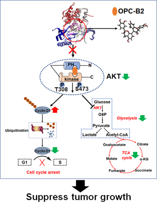 OPC-B2是一種具有特殊結構的多酚黃酮類化合物,由兩個表兒茶素連接形成,可從花生紅衣、蘋果、葡萄等食物中提取。以往研究發(fā)現(xiàn),原花青素具有抗氧化與抗炎等生物活性,可降低膽固醇水平,保護血管內皮細胞免受自由基對血管內皮的損害,從而預防心血管疾病、降低血脂和血糖及發(fā)揮抗腫瘤作用等。該研究發(fā)現(xiàn),花生紅衣中提取的OPC-B2直接結合并抑制AKT活性和下游信號通路,從而抑制肝癌細胞的增殖、代謝及腫瘤生長;研究進一步發(fā)現(xiàn),與已知的AKT變構抑制劑MK-2206相似,OPC-B2可與AKT的催化結構域及PH結構域結合,從而抑制AKT活性;Lys297和Arg86作為AKT與OPC-B2結合的關鍵位點,突變后解除OPC-B2的抗腫瘤作用。