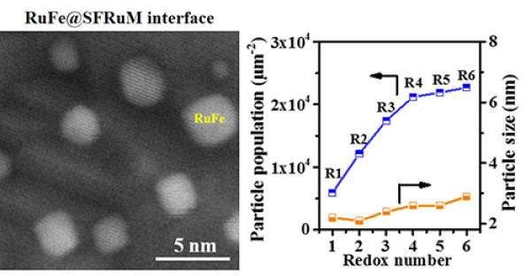 該工作中,科研人員制備了Ru摻雜的Sr2Fe1.4Ru0.1Mo0.5O6-δ(SFRuM)雙鈣鈦礦,通過氧化還原循環(huán)處理使RuFe合金納米顆粒密度從5900個μm-2(R1)增加到22680個μm-2(R6),平均粒徑在2.2~2.9nm之間,有效調控了RuFe@SFRuM界面密度??蒲腥藛T結合原位氣氛電子顯微鏡及元素分布和電子能量損失譜表征,揭示出在還原和氧化氣氛下RuFe@SFRuM界面的形成和再生機制,闡明了表面Ru元素富集促進溶出高密度RuFe@SFRuM界面的內在本質。原位氣氛電鏡、電化學交流阻抗譜結合密度泛函理論計算證實,RuFe@SFRuM界面促進了CO2吸附活化。與SFRuM陰極相比,RuFe@SFRuM陰極在1.2V時,CO2電解電流密度提高了74.6%,在1000小時,CO2電解測試中表現(xiàn)出高穩(wěn)定性。該研究為固體氧化物電解池高效穩(wěn)定電解CO2提供了新策略。