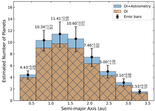通過模擬行星軌道演化及相位狀態(tài)對亮度與視位置的影響,研究團隊發(fā)現(xiàn),CHES提供的先驗軌道信息可顯著優(yōu)化HWO的觀測策略。通過引入CHES軌道參數(shù),HWO可大幅減少觀測次數(shù)與曝光時間,還能有效提升觀測信噪比。研究團隊通過注入模擬行星樣本,評估兩種模式下的探測完備度、觀測效率與預(yù)期產(chǎn)出,結(jié)果顯示差異顯著。數(shù)值結(jié)果表明,相較無先驗數(shù)據(jù)情形,CHES的先驗數(shù)據(jù)可使HWO的觀測完備度平均提升約10%,探測效率(單位時間內(nèi)的信號獲取能力)提升幅度達2~30倍,具體取決于目標恒星與行星參數(shù)。此外,基于Kepler數(shù)據(jù)推導(dǎo)的類地行星生成率,研究團隊估算了在不同生成率與宜居帶模型下的總探測產(chǎn)出。CHES提供的先驗數(shù)據(jù)可將HWO預(yù)期發(fā)現(xiàn)的系外宜居行星數(shù)量從約37顆提升至約54顆,顯著增強其科學(xué)產(chǎn)出能力。
