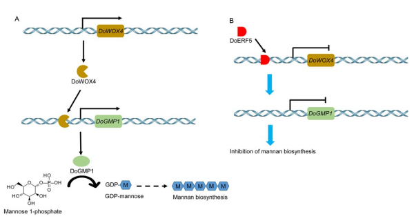 綜上研究結(jié)果,研究人員提出了ERF5-WOX4調(diào)控鐵皮石斛甘露聚糖生物合成的工作模型:DoWOX4蛋白與DoGMP1啟動(dòng)子結(jié)合,激活DoGMP1表達(dá),促進(jìn)甘露聚糖的生物合成;而DoERF5與DoWOX4啟動(dòng)子結(jié)合,下調(diào)DoWOX4和DoGMP1的表達(dá),抑制甘露聚糖的生物合成。