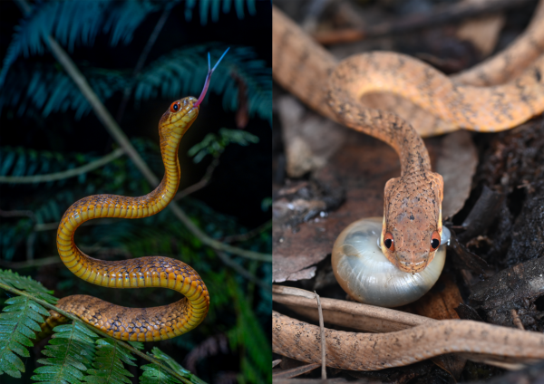 攝食策略的轉(zhuǎn)變深遠(yuǎn)影響著物種向新生態(tài)位的擴(kuò)散,推動(dòng)了其生理和形態(tài)上的適應(yīng)演化。鈍頭蛇科蛇類專以蛞蝓和蝸牛為食,而這一取食策略伴隨著多重挑戰(zhàn),包括如何從殼中攝取蝸牛、如何有效分解獵物分泌的大量黏液,以及如何在低脂攝入下維持能量代謝。為應(yīng)對(duì)這些挑戰(zhàn),鈍頭蛇類演化出一系列特殊表型,如短小的吻部、左右不對(duì)稱的下頜齒,以及具有特殊分泌功能的膨大下唇腺等,是研究動(dòng)物食性特化背后遺傳機(jī)制的理想對(duì)象。