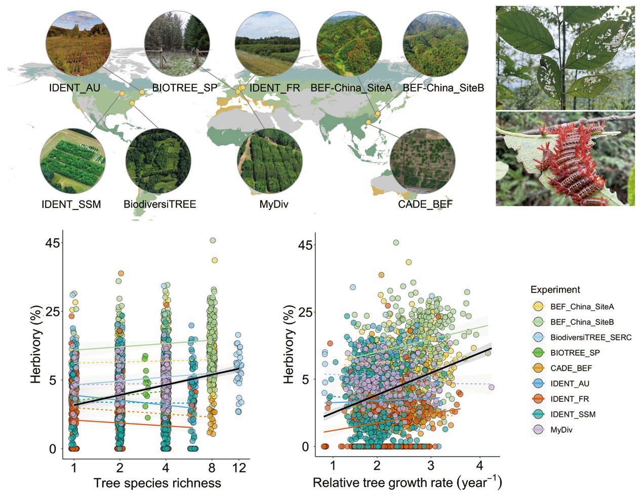 隨著氣候變化、森林砍伐和蟲害暴發(fā)日益嚴(yán)重,全球森林功能和健康受到威脅。因此,理解樹木、昆蟲及環(huán)境之間的復(fù)雜關(guān)系,有助于制定有效的管理政策。近年來(lái),在全球生態(tài)系統(tǒng)恢復(fù)和可持續(xù)發(fā)展目標(biāo)推動(dòng)下,森林恢復(fù)項(xiàng)目廣泛展開,增加樹種多樣性被認(rèn)為是提高森林生產(chǎn)力的有效途徑。然而,隨之出現(xiàn)的關(guān)鍵問(wèn)題是,樹種多樣性越高,森林蟲害是否也會(huì)隨之加劇。此前研究大多局限于單一區(qū)域,植物與植食者相互作用的全球性模式尚不明晰。