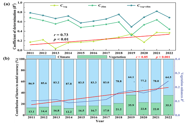 研究將環(huán)境因子劃分為植被因子和氣候因子,結(jié)合多元逐步回歸與機(jī)器學(xué)習(xí)方法,從多時間尺度和不同恢復(fù)年限兩個維度系統(tǒng),評估了二者對修復(fù)濕地碳通量的相對貢獻(xiàn)。結(jié)果表明,濱海濕地長達(dá)12年的自然恢復(fù)過程中,植被與氣候因子共同決定生態(tài)系統(tǒng)的CO2凈交換量(NEE)。隨著時間尺度延長,氣候因子為NEE年際變化的主要驅(qū)動因素,但植被對NEE變異的解釋能力逐漸增強(qiáng)。年度尺度進(jìn)一步分析表明,在基于氣候因子的模型中引入植被因子,可顯著提升模型解釋力,且隨著恢復(fù)年限增加,提升效應(yīng)更為明顯。這說明植被改善過程,在一定程度上減弱了氣候因子對CO2封存能力的主導(dǎo)影響,從而增強(qiáng)了生態(tài)系統(tǒng)碳匯功能穩(wěn)定性。