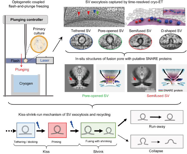 實(shí)驗(yàn)中,團(tuán)隊(duì)在神經(jīng)元中表達(dá)光敏蛋白,通過激光精準(zhǔn)激發(fā)動(dòng)作電位,觸發(fā)突觸囊泡釋放。此后,載有樣品的電鏡載網(wǎng),在設(shè)定時(shí)間快速落入冷凍劑,將細(xì)胞瞬間固定。通過精確控制光照與冷凍的時(shí)間間隔,團(tuán)隊(duì)在4毫秒到300毫秒之間的時(shí)間釋放樣品,捕獲了囊泡不同階段的結(jié)構(gòu)快照。