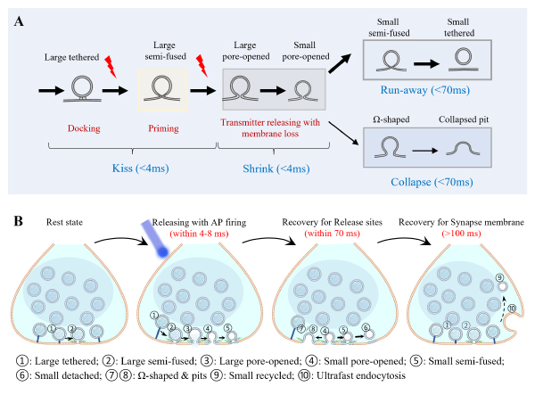 大腦功能的實(shí)現(xiàn),依賴于數(shù)千億個(gè)神經(jīng)元之間高效、精準(zhǔn)的突觸傳遞。突觸囊泡作為神經(jīng)遞質(zhì)的載體,其釋放機(jī)制是神經(jīng)科學(xué)領(lǐng)域的重要問題。此前,科學(xué)界圍繞囊泡釋放機(jī)制,提出了“全融合”與“親吻-逃逸”兩種對立模型。但是,由于囊泡釋放過程發(fā)生在毫秒時(shí)間尺度、結(jié)構(gòu)變化處于納米空間尺度,傳統(tǒng)技術(shù)難以捕捉其瞬時(shí)動(dòng)態(tài),導(dǎo)致神經(jīng)科學(xué)研究長期陷入困局。