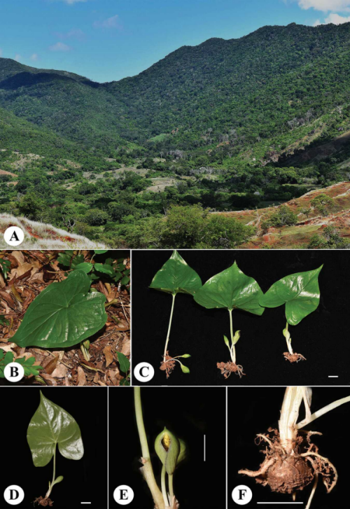 2025年1月,中國科學院武漢植物園,與津巴扎扎動植物園、塔那那利佛大學組成聯(lián)合科考隊。在馬達加斯加北部達萊納地區(qū)進行野外本底調(diào)查期間,科考隊關(guān)注到一個林下地生的灰?guī)r芋屬居群,該屬植物通常被認為是典型的石生類型。經(jīng)野外初步觀察,該灰?guī)r芋屬植物葉為寬心形-箭形,與2012年在該地區(qū)發(fā)表的Carlephyton darainense相似,但其黃色的肉穗花序以及單雄蕊的雄花序,引起了研究人員的注意。