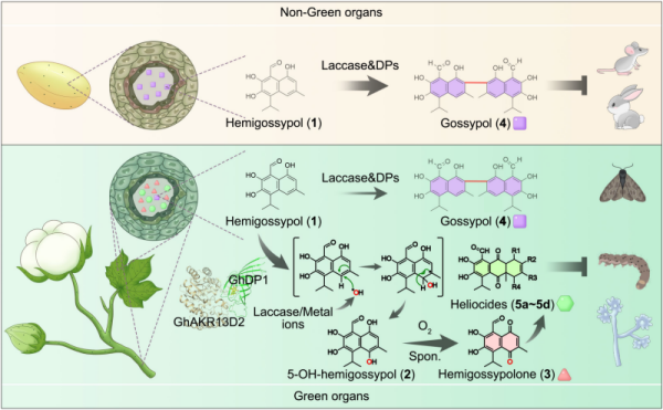 科研團隊通過多組學整合分析,鑒定出GhDP1和GhAKR13D2兩個關鍵蛋白,它們在棉花綠色組織中協(xié)同調控萜類防御代謝流的重定向。團隊發(fā)現(xiàn),在氧化條件下,GhDP1與GhAKR13D2可協(xié)同催化半棉酚的羥基化反應,生成中間體5-羥基-半棉酚,并經自發(fā)氧化形成半棉酚酮。這一反應途徑引導代謝流從棉酚合成轉向更具防御活性的半棉酚酮及其衍生物殺夜蛾素的生成。