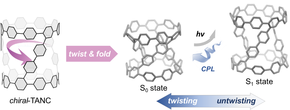 科研人員從定點官能化的環(huán)對苯撐出發(fā),通過軸向官能團轉(zhuǎn)化和苯-苯鍵的共價連接,分別合成了手性-TANC和內(nèi)消旋-TANC兩種異構(gòu)體。手性-TANC,可視為缺陷石墨烯片段的卷曲對應(yīng)體,在光激發(fā)下可通過橋聯(lián)苯單元的折疊/解旋,實現(xiàn)構(gòu)象動態(tài)運動,從而產(chǎn)生螺旋手性的動態(tài)演化。內(nèi)消旋-TANC,在結(jié)構(gòu)上對應(yīng)缺陷聯(lián)苯網(wǎng)絡(luò)的卷曲片段,其晶體結(jié)構(gòu)顯示橋聯(lián)苯單元,存在顯著的扭曲應(yīng)變,增強了分子整體構(gòu)象的剛性。