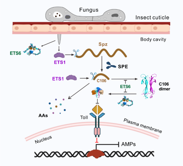 團隊進一步通過酵母細胞的正反向雙雜、蛋白水平的互作驗證,證明綠僵菌M28家族的金屬蛋白酶ETS1和功能未知的ETS6同Sp?tzle及C106均存在互作。生化功能等驗證表明:氨肽酶ETS1可降解Sp?tzle和C106;昆蟲免疫應(yīng)答可上調(diào)、“補償”表達Sp?tzle,但ETS6可阻止C06二聚化,又可挾持、阻止C106二聚體同Toll受體結(jié)合,從而抑制抗菌肽表達。不同昆蟲的Sp?tzle/C106氨基酸序列高度分化,但不同昆蟲甚至非昆蟲無脊椎動物的C-末端成熟配體,可形成結(jié)構(gòu)高度相似的二聚體結(jié)構(gòu)。ETS1和ETS6可作用于不同昆蟲的免疫配體,表現(xiàn)出廣譜殺蟲活性。