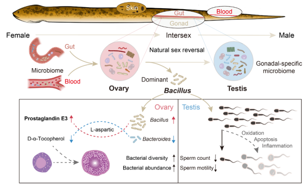 該研究揭示了卵巢優(yōu)勢(shì)細(xì)菌芽孢桿菌在雌雄同體黃鱔性腺中的雙向調(diào)控功能,反映出卵巢和精巢優(yōu)勢(shì)菌在性反轉(zhuǎn)中的重要功能。研究從性腺共生菌穩(wěn)態(tài)角度,回答了“黃鱔性反轉(zhuǎn)為什么往往發(fā)生在第一次排卵后”這一問題,為解析黃鱔性反轉(zhuǎn)自然發(fā)生的影響因素提出新方向,也為開發(fā)益生菌定向誘導(dǎo)黃鱔性別提供了新思路。